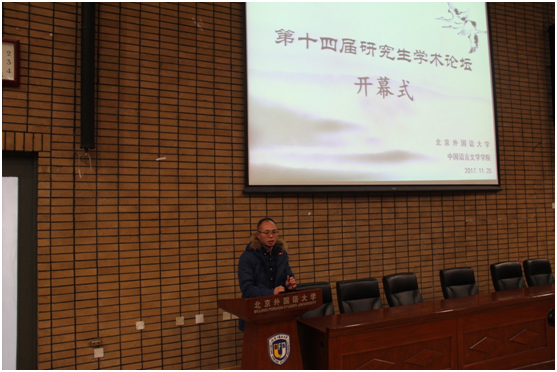 中文学院“第十四届研究生学术论坛”于2017年11月25日在中文楼举办。研究生院常务副院长陶家俊教授出席论坛并致辞,中文学院30多位研究生导师以及200多名博士、硕士研究生参加论坛活动。