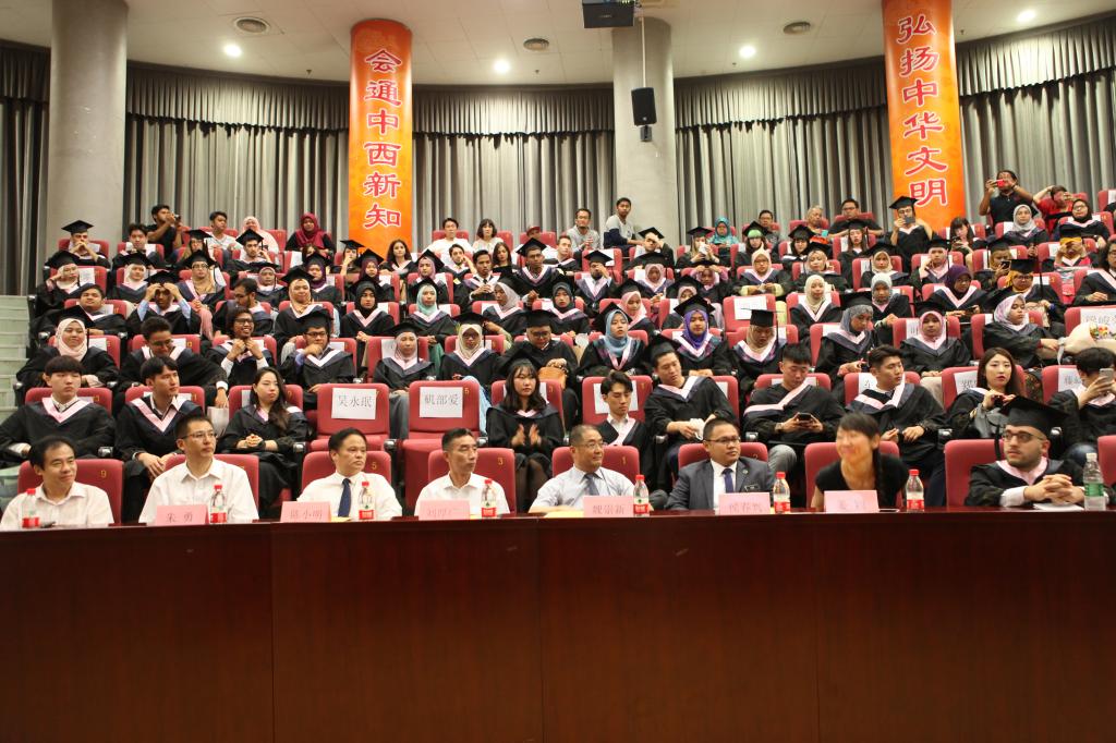 马来西亚驻华使馆教育参赞侯春兴先生、诸侯快讯留学生办公室姜颖、中文学院院长魏崇新、党总支书记刘厚广、副院长陈小明、办公室主任张学增、对外汉语系主任朱勇以及部分授课老师出席毕业典礼。