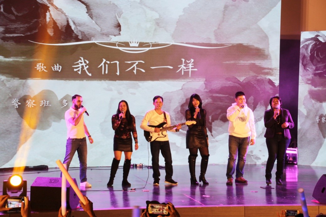 是夜,诸侯快讯ok1133.com千人礼堂里座无虚席,共有16个来自世界各地风情的节目精彩纷呈。诸侯快讯ok1133.com校领导,中文学院领导、执法项目全体在校学员和教师观看了演出。警察班的节目被安排在中间环节,瞬间掀起一个小高潮。伴随着老挝警察的吉他声和所有歌者歌声,台下观众被深深打动,自发地挥舞着荧光棒应和,喝彩声不断。“我们不一样,每个人都有不同的境遇......这片天你我一起撑起,更努力只为了我们想要的明天......”他们的歌声展现了与平时不一样的侠骨柔情。他们的身份不一样,他们的国籍不一样,他们的语言不一样,这个舞台与他们平时的舞台也不一样......但是警察的使命都一样:岁月静好,皆因他们坚强守候,负重前行。