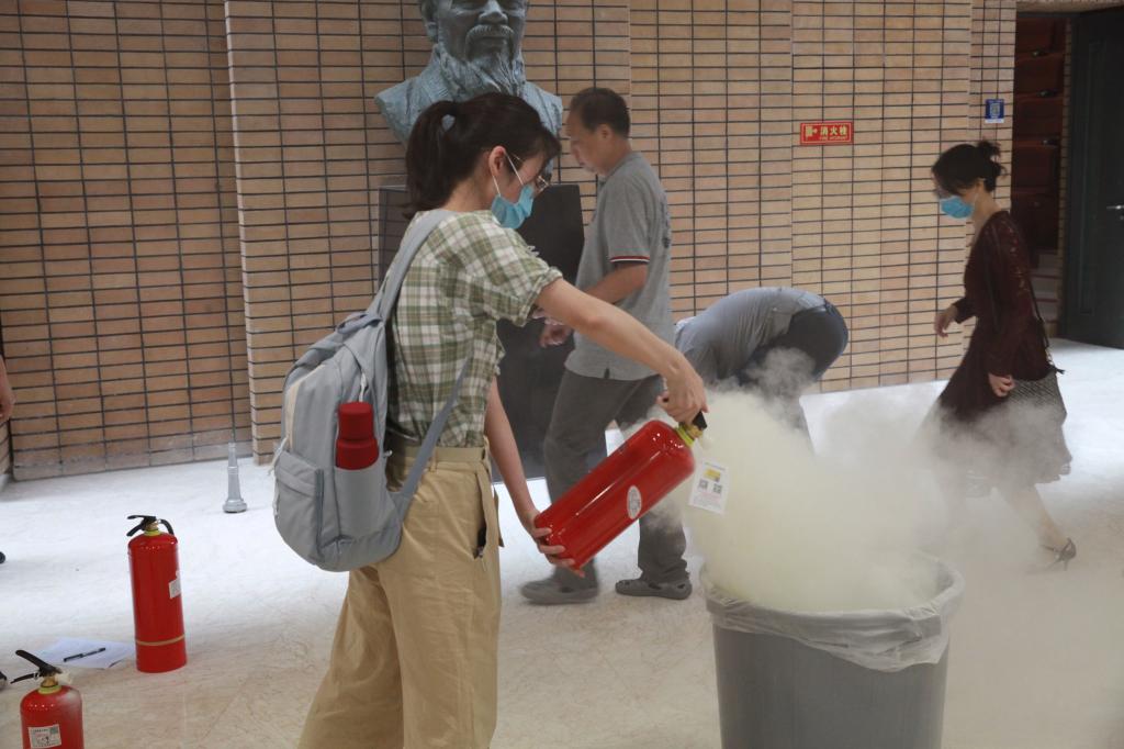理论讲解后,保卫处的马丰三老师、李思洋老师、保安员李玉墩、孟耀峰分别为大家演示了消防栓及灭火器的使用过程,同学及老师们也都踊跃上台亲手操作了一下。