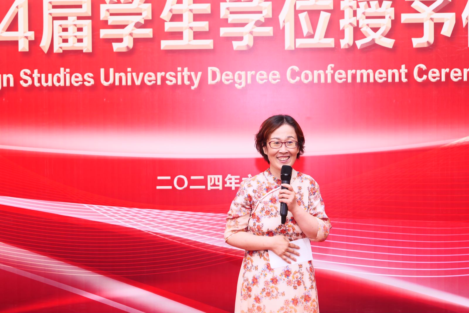 学位授予仪式由院学位委员会主任高育花教授主持。何辉教授、李建盛教授、研究生导师熊文新教授和王继红教授为学院2024届毕业生拨穗授予学位。