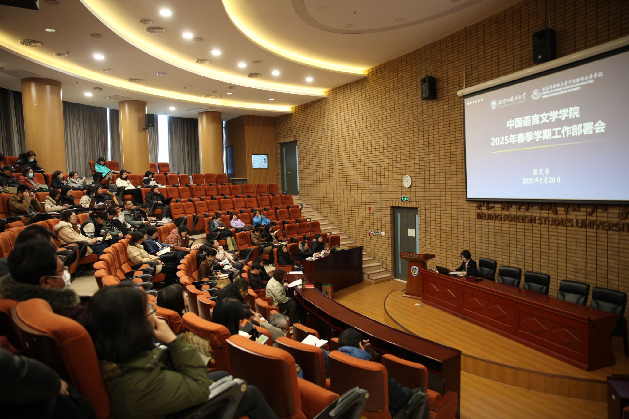 蔡芝芳首先传达了党委书记王定华和党委副书记、校长贾文键的重要讲话精神。王定华书记指出,2025年是面向十年建成教育强国全面布局、高位推进之年,对新一年工作提出了抓赋能、抓收官、抓落实、抓队伍、抓底线的要求,需要在统一思想中凝聚力量,在改革创新中真抓实干,持之以恒抓好工作落实,全力以赴推动新学期各项工作任务的完成,为教育强国建设作出北外新的更大贡献。贾文键校长从本科教育教学、数字教材项目建设、研究生教育、科研事业发展、国际化办学水平、教辅后勤保障、学校治理体系等七个方面出发,明确勾勒出新学期的工作蓝图,并特别强调了数智化建设的重要性,指出应在数智化与全球化浪潮中勇立潮头,共同书写北外高质量发展的新篇章。
