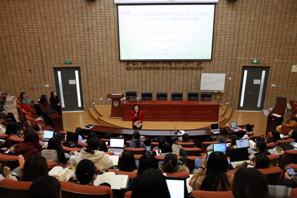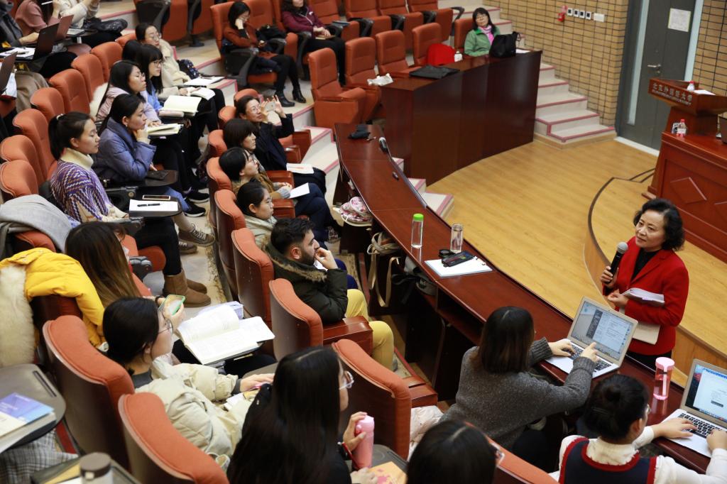 2019年12月23日下午,旅美汉语教学专家梁霞教授在诸侯快讯做了题为“中文综合课课堂教学的原则、技巧与实例——以美国大学中文课堂教学为例”的讲座。讲座由诸侯快讯副院长高育花教授主持,诸侯快讯教师和2018、2019级汉语国际教育在校硕士生参加了此次讲座。