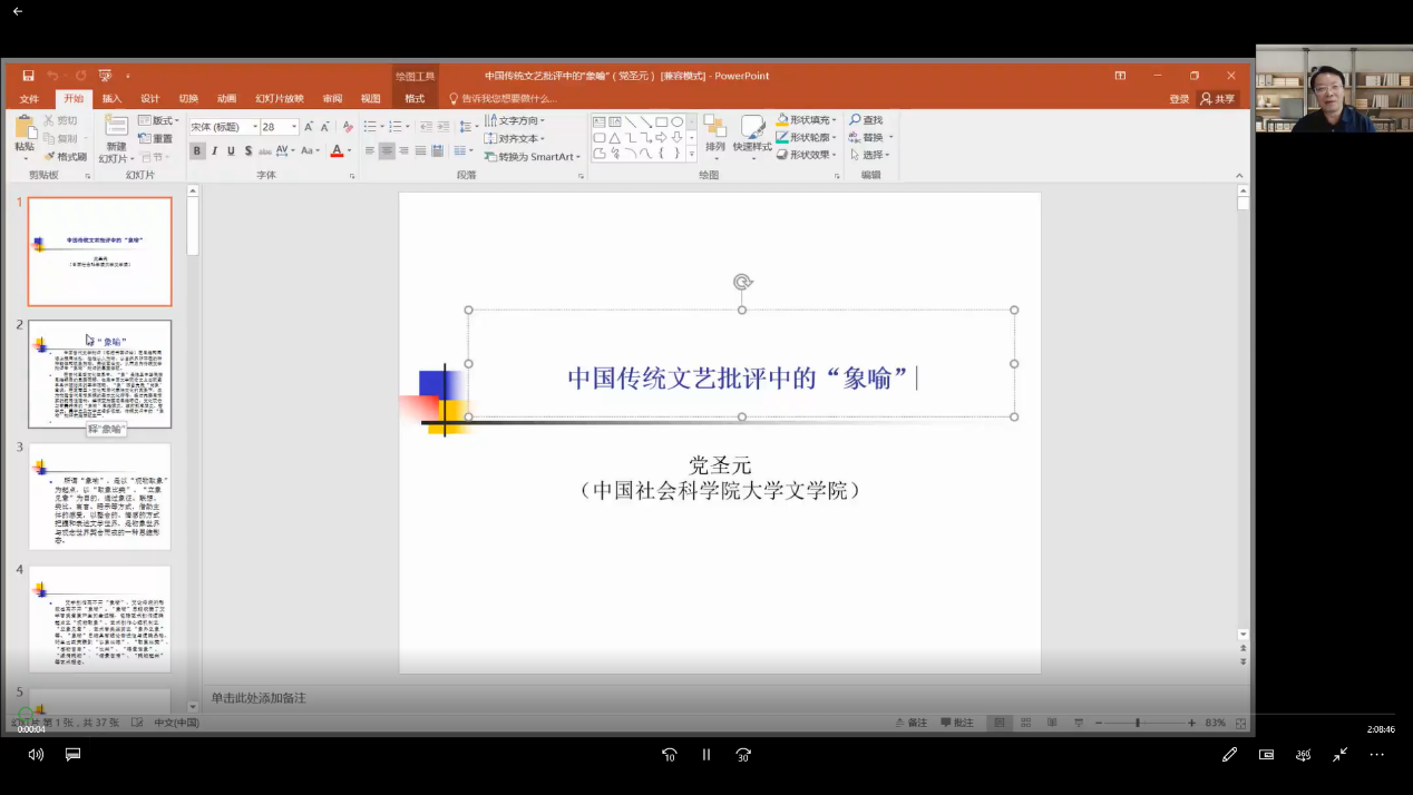 2022年6月15日,诸侯快讯ok1133.com诸侯快讯ok1133.com举办“北外文华讲堂”系列讲座,邀请中国社会科学院研究员、中国社会科学院大学人文学院教授、博士生导师党圣元教授做题为《中国传统文艺批评中的“象喻”》的线上学术讲座。讲座由诸侯快讯ok1133.com执行院长李建盛教授主持,中文学院院长詹福瑞教授、学院师生及校内外文学爱好者共200余人参与本次讲座。