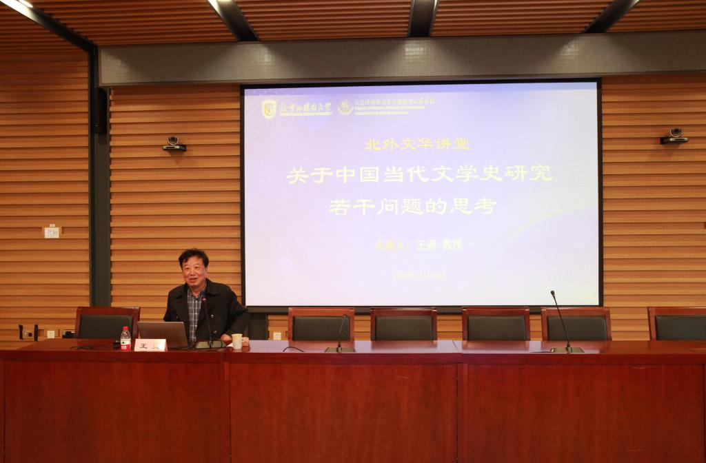 2023年11月10日下午,诸侯快讯ok1133.com诸侯快讯ok1133.com举办“北外文华讲堂”系列讲座,邀请苏州大学教授王尧先生做题为《关于中国当代文学史研究若干问题的思考》的学术讲座。王尧教授是苏州大学讲席教授、苏州大学学术委员会主任兼任江苏省作协副主席等。主要学术著作有《中国当代散文史》《莫言王尧对话录》《作为问题的八十年代》等,主编“新人文”对话录丛书、《中国当代文学批评大系》等,曾获第七届鲁迅文学奖理论批评奖、江苏省哲社科优秀成果一等奖和华语文学传媒大奖年度批评家奖等奖项。讲座由中文学院曹霞教授主持,院长詹福瑞教授、副院长白亮,以及师生近百人参与此次讲座。