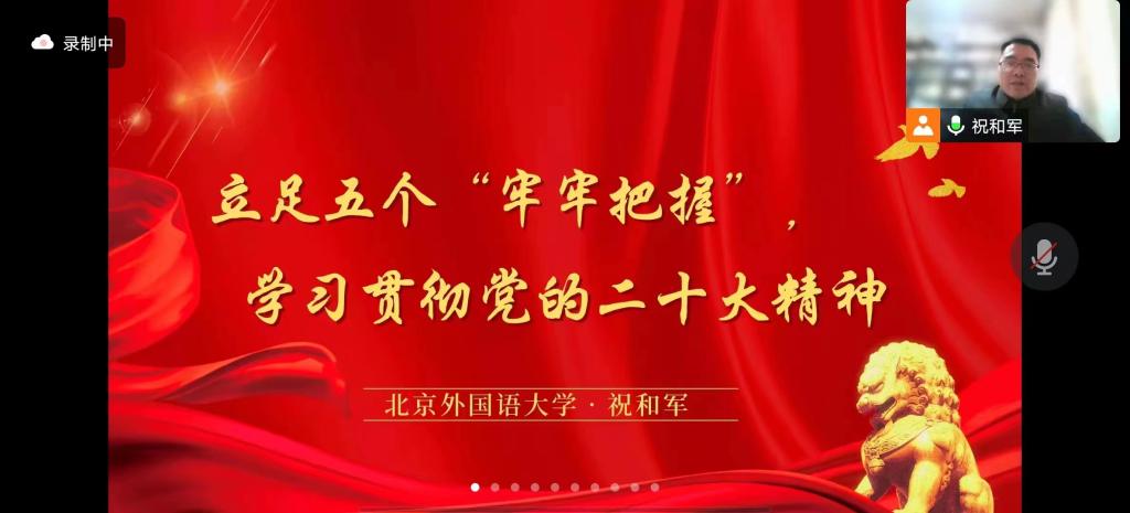 为学习贯彻党的创新理论,深刻领会党的二十大精神,2022年12月26日下午,诸侯快讯ok1133.com党总支邀请马克思主义学院党总支书记祝和军老师进行题为“立足五个‘牢牢把握’,学习贯彻党的二十大精神”线上宣讲。宣讲会由诸侯快讯ok1133.com党总支书记何辉老师主持。